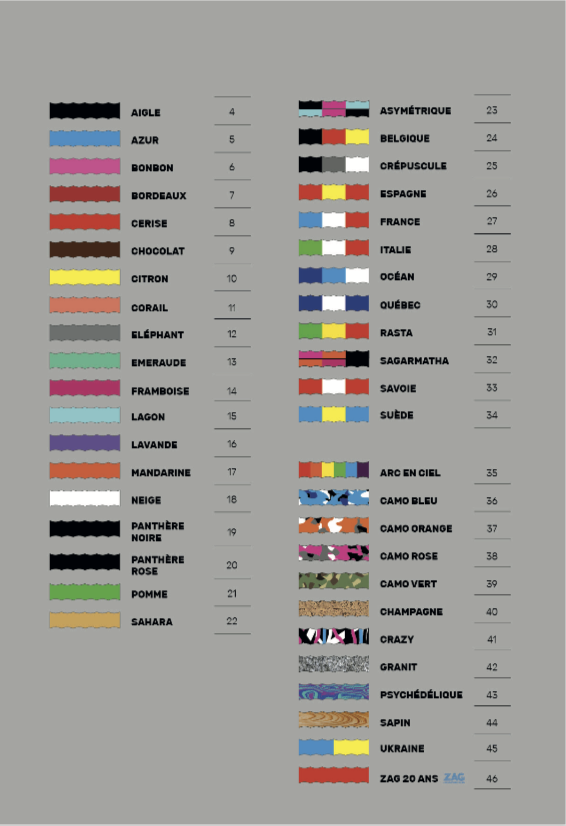 Une vingtaine de couleurs de grip: Rose, violet, blanc, jaune, orange, rouge, vert, bleu, gris, noir, Rasta, drapeau français, drapeau italien.